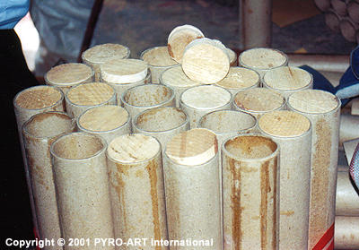 BODENANSICHT AUF EINE FEUERWERKSBATTERIE BEI DER MONTAGE: