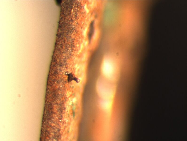 Version vom 4. September 2015, 10:09 Uhr von Matchbox (Diskussion | Beiträge) (Detailansicht linke Lamelle, von seitlich links, mit Schmelztropfen des Brückendrahtes.)
