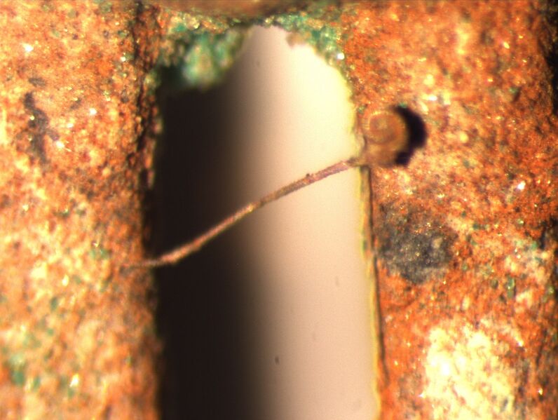 Schwarz oxydierte Stelle auf der rechten Lamelle an der wohl ursprünglich die Glüdrahtschnecke befestigt war.