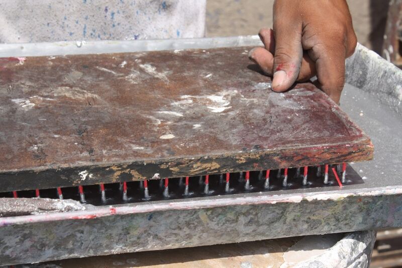 Chispitas - Die Zündschnüre in ihren Wachsrahmen werden in das dickflüssige Satzgemenge getaucht.